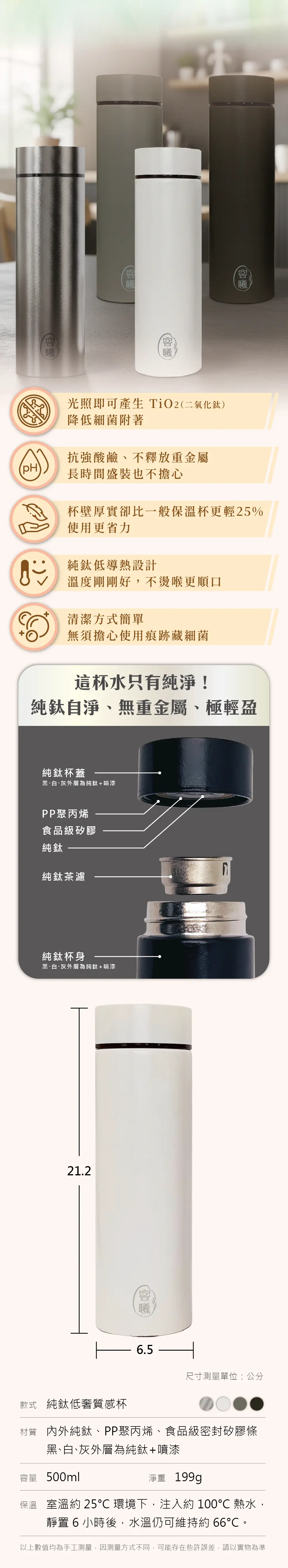 | 材質 | 杯身:內外純鈦(白、灰、黑為純鈦+噴漆) |