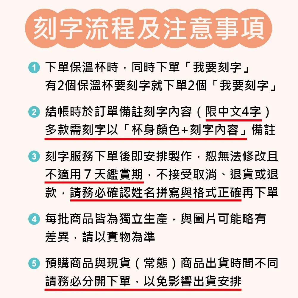 | 刻字注意事項 | 1.下單保溫杯時,同時下單「我要刻字」,有2個保溫杯要刻字就下單2個「我要刻字」。 |