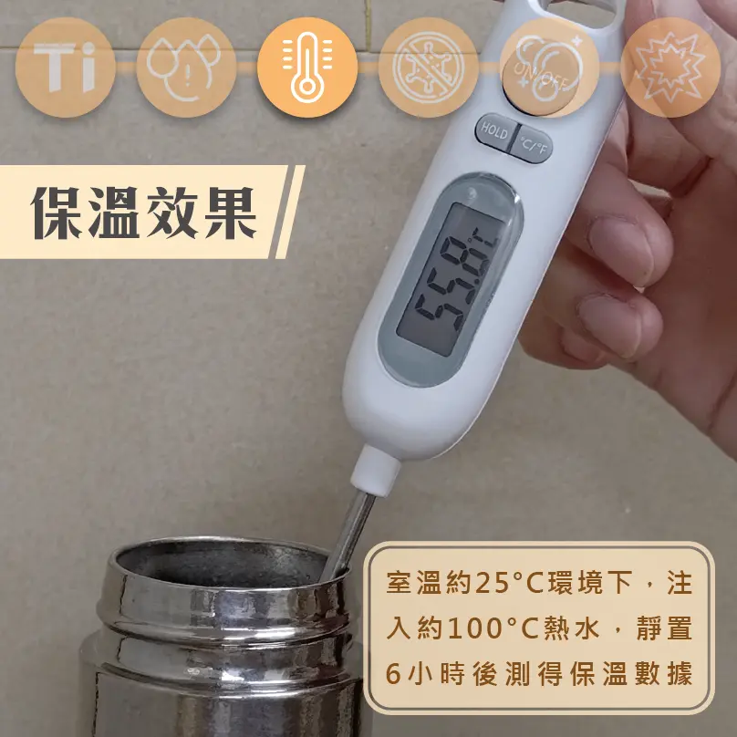 | 保溫效力 | 室溫約 25°C 環境下,注入約 100°C 熱水, |